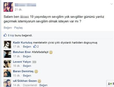 14 Şubat’a sayılı günler kala bugün 19 yaşındaki bir kız adına açıldığı belirtilen hesaptan gruba yazılan ilan ise şaşırttı. 19 yaşındaki B.O. isimli kız adı ile açılan hesaptan, “Selam, 19 yaşındayım. Sevgilim yok. Sevgililer Gününü yalnız geçirmek istemiyorum. Sevgilim olmak isteyen var mı?” yazısı paylaşıldı. Bunun üzerine grubun diğer üyeleri ise, “Memleketin çivisi çıktı. Harbiden doğruymuş” yorumunda bulundu.