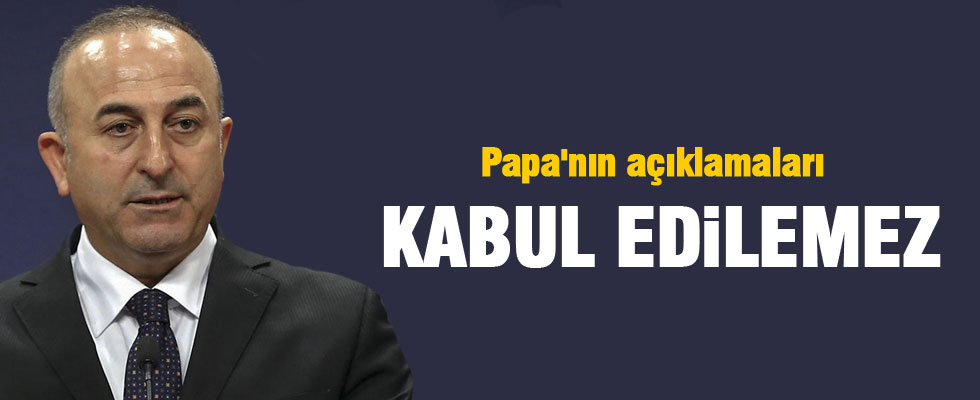 'Papa'nın açıklamaları kabul edilemez' diyen Dışişleri Bakanı Mevlüt Çavuşoğlu, 'Papa'nın tarihi ve hukuki gerçeklerden uzak beyanı kabul edilemez. Dini makamlar mesnetsiz ithamlarla kin ve nefreti körükleme yeri değildir' ifadelerini kullandı.