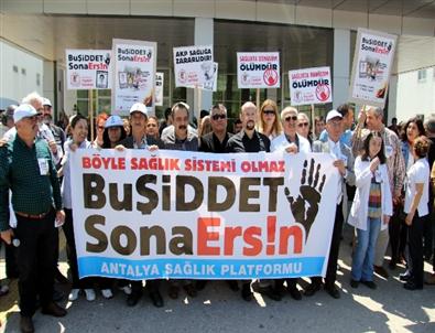 Antalya Tabip Odası, Antalya Diş Hekimleri Odası, Antalya Veterinerler Hekimler Odası, SES Antalya Şubesi, Türk Hemşireler Derneği Antalya Şubesi, Türk Ebeler Derneği Antalya Şubesi ve Sosyal Hizmet Uzmanları Derneği’den oluşan grup üyeleri Antalya Eğitim Araştırma Hastanesi bahçesinde bir araya gelip “Böyle sağlık sistemi olmaz. Sağlıkta şiddet sona Ersin” yazılı pankart açtı. Ellerinde “Sağlıkta dönüşüm ölümdür” yazılı döviz taşıyan grup, bir süre slogan attı.