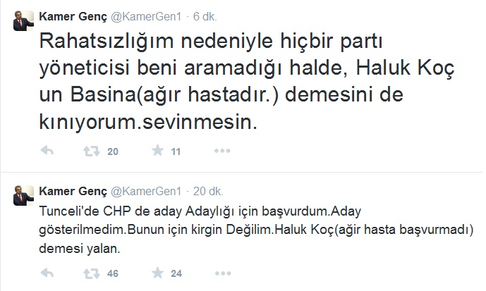 Genç, Twitter'dan yaptığı açıklamada 'Tunceli'de CHP de aday adaylığı için başvurdum. Aday gösterilmedim. Bunun için kirgin Değilim.Haluk Koç(ağir hasta başvurmadı) demesi yalan.' dedi.