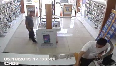 Yaşanan hırsızlık işyerinin güvenlik kameraları tarafından saniye saniye kaydedildi. Görüntülerde, peşpeşe işyerine giren iki şüpheliden birisinin işyeri sahibini oyaladığı, diğerinin ise masa üzerindeki cep telefonunu cebine koyduktan sonra işyerinden ayrıldığı görülüyor. Şüphelinin dikkat çekmemek için önce ufak bir cihazı parayla satın aldığı ve para üstünü aldığı sırada el çabukluğunu kullanarak masadaki cep telefonunu cebine koyduğu gözlendi. Görüntüler, diğer şüphelinin işyerinden çıkmasıyla son buluyor.