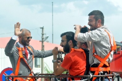 Mahmut Alan, basın mensuplarıyla birlikte bir vincin üzerine çıkarak, 20 metre yükseklikte