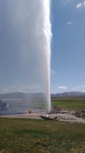 Ağrı’nın Diyadin ilçesinde kuyu ağzı çalışması sırasında kapağı açılan sondaj kuyusundan 30 metre yüksekliğe termal su fışkırdı.