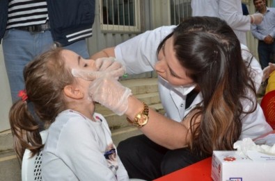 Törende İl Halk Sağlığı Müdürlüğüne ait gezici diş bakım aracında çocuklara ağız-diş sağlığı eğitimi vermek amacıyla açılan stantta doktorlar tarafından çocuklara flor vernik uygulaması yapıldı.