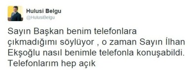 Fenerbahçe Kongre Üyesi Hulusi Belgü, twitter üzerinden yaptığı açıklamada, "Sayın Başkan benim telefonlara çıkmadığımı söylüyor, o zaman Sayın İlhan Ekşoğlu nasıl benimle telefonla konuşabildi. Telefonlarım hep açık" ifadelerini kullandı.