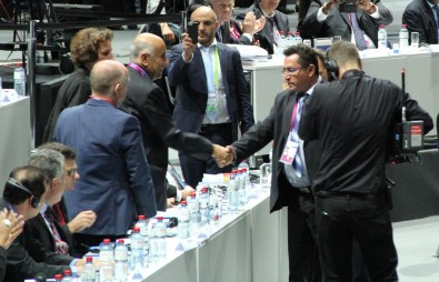 Konuşmaların ardından İsrail Futbol Federasyonu Başkanı Ofer Eini, Rajoub'un yanına gelerek elini sıktı.