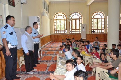 Kur’an öğrenmek için kursları dolduran minik öğrenciler de trafik kuralları hakkında bilmedikleri konuları polis amcalarına sormak ve öğrenmek için birbirleri ile adeta yarışa girdi.