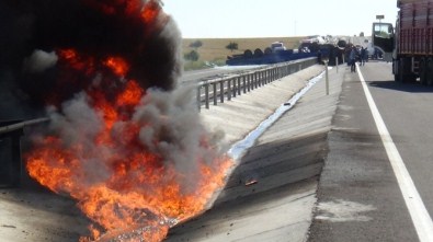 Aksaray’da cam yüklü TIR’ın devrildiği kazada sürücü yaralanırken, önce TIR, sonra da TIR’ın yakıt deposundan akan mazot refüjde metrelerce yandı.