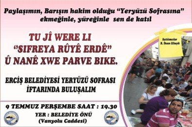 Erciş’te ilk defa ’Yeryüzü Sofrası’ kurulacak. Erciş Belediyesi’nin düzenleyeceği Ramazan ayı programları çerçevesinde 9 Temmuz Perşembe günü Van yolu Caddesi’nde herkesin katılabileceği iftar sofrası kurulacak. Belediyenin organizasyonu ile kurulacak iftar sofrasına İlahiyatçı Yazar R. İhsan Eliaçık’ da katılacak. ’’Paylaşımın olduğu yeryüzü sofrasına sen de ekmeğinle katıl’’ çağrısıyla kurulacak yeryüzü sofrasının duyuru çalışmaları devam ediyorken katılımın yoğun olması bekleniliyor.