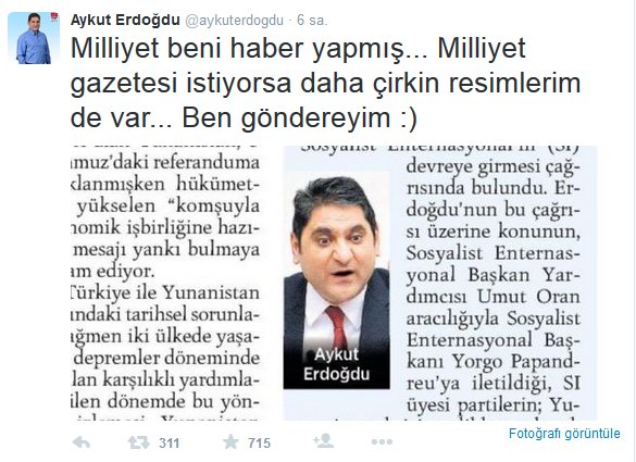 Sosyal paylaşım sitesinden 'Milliyet beni haber yapmış... Milliyet gazetesi istiyorsa daha çirkin resimlerim de var... Ben göndereyim' diyen Erdoğdu, gazetenin haberini de paylaştı.