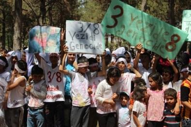 Üzerinde, İngilizce ve Kürtçe yazıların bulunduğu pankartlar açan Ezidiler, saldırıda kaybettikleri yakınlarını fotoğraflarını taşıdı. Ayrıca, etkinlikte genç kadın ve erkeklerin üzerinde kırmızı yazılar bulunan beyaz tişörtler giymesi dikkat çekti.