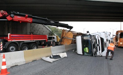 Kağıthane'de damperi açık kalan hafriyat tırı köprüye çarparak yan yattı. Kazada sürücü yaralandı.