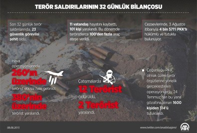 AA muhabirinin derlediği bilgilere göre, son 32 gündeki (7 Temmuz-7 Ağustos) terör saldırılarında, aralarında Muş'un Malazgirt ilçesi Jandarma Komutanı Binbaşı Arslan Kulaksız'ın da bulunduğu 23 güvenlik görevlisi (asker, polis ya da korucu) şehit edildi, biri İran uyruklu 11 kişi hayatını kaybetti, 3'ü İran uyruklu 101 kişi yaralandı.