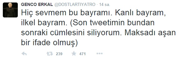 Gelen tepkilerin ardından mesajının son kısmını silen Genco Erkal, ''Hiç sevmem bu bayramı. Kanlı bayram, ilkel bayram. (Son tweetimin bundan sonraki cümlesini siliyorum. Maksadı aşan bir ifade olmuş)'' notuyla yeni bir mesaj yayınladı.