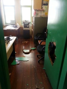 Okulun kapısını kırarak içeri giren kimliği belirsiz kişiler okulların penceresini, masalarını, dolaplarını ve bilgisayarlarını kırarak maddi zarar verdi.