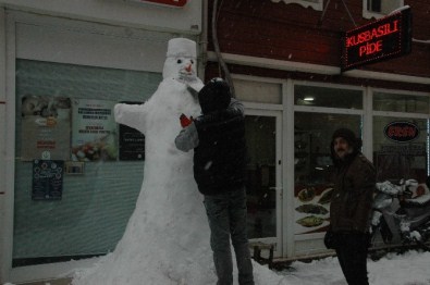Uğur Eren isimli esnaf, "Kış aylarında iş yoğunluğumuz oldukça azalıyor. Biz esnaflar olarak vakit buldukça kardan adam yapıyoruz. Şimdi yaklaşık 3 metre boyunda ilçenin en uzun kardan adamını yaptık. Çocuklar gibi de sevindik" dedi.