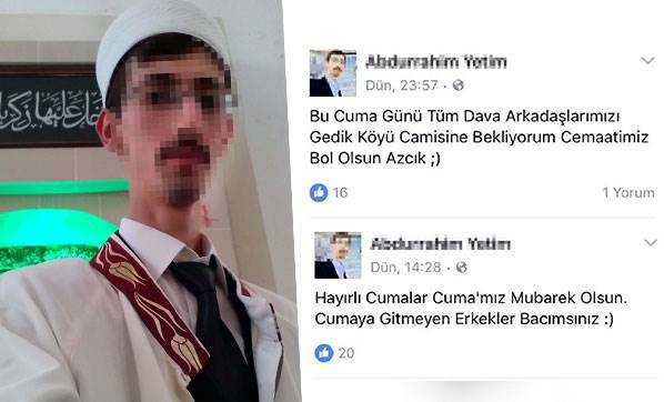 Çanakkale'nin Bayramiç ilçesi Gedik köyü İmamı A.Y., kendisine ait sosyal paylaşım sitesi Facebook hesabından, ’Hayırlı cumalar cuma’mız mübarek olsun. Cumaya gitmeyen erkekler bacımsınız’ paylaşımında bulununca tepki topladı. İmam A.Y. tepki çeken mesajını sildikten sonra bir mesaj daha yayınladı ve özür diledi.