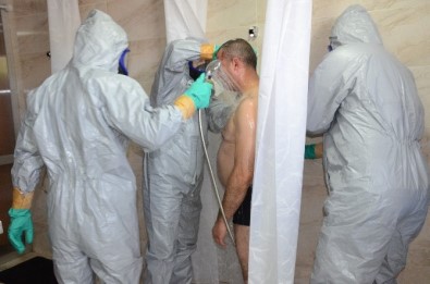 Kimyasal-Biyolojik-Radyasyon-Nükleer bulaşma nedeniyle gelen afetzedeleri özel giysili ve malzemeli personeller tarafından yıkanarak tedaviye hazırlanma işlemi sonrası tatbikatın bir sonraki aşamasına geçildi. Tatbikat senaryosu gereği alarm düğmesine basılmasıyla birlikte olay yerine güvenlik personeli intikal ederek olaya müdahale edildi. İlgili Hastane Afet Planı Ekibi, Eskişehir UMKE, İtfaiye, 112 Ambulans ekipleri aranarak olay yerine gelmesi sağlandı. Olay yerinde gerekli güvenlik tedbirleri alındı ve doğalgaz vanaları kapatıldı. Asansörle tahliyeler sona erdiğinde ise elektrikler kesildi. Hastane AMATEM biriminde meydana gelen yangın nedeniyle hasta ve personellerin anonslar eşliğinde panik yapmadan tahliye edilmeleri sağlandı. Yaralananlar 112 acil ambulans ekipleri tarafından tespit edilerek alındı. Bu arada 3. kattaki dumandan etkilenen ve aşağıya inemeyen afetzedeler itfaiyenin kurtarma tüneli ile aşağıya alınması dikkat çekti. Aşağı kattaki inemeyenler ise itfaiye merdiveni ile güvenli bir şekilde alındı. Aşağıda afet çadırlarında bekleyen sağlık personeli tarafından ilk müdahaleleri yapılan hastaların tahliyeleri Eskişehir UMKE tarafından gerçekleştirildi.