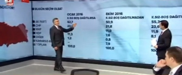 A Haber ekranlarında yayınlanan Söz Teması programında açıklamada bulunan Adil Gür, 'Bugün seçim olsa kime oy verirdiniz' sorusuna Temmuz sonunda 'Yüzde 58 AK Parti' denildiğini ancak sonra yüzde 55 oranında sabitlendiğini söyledi.