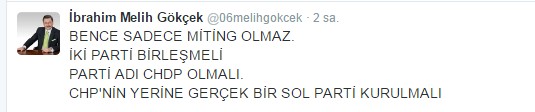 Konuya ilişkin tweet atan Ankara Büyükşehir Belediye Başkanı Melih Gökçek, 'Bence sadece miting olmaz. İki parti birleşmeli. Parti adı CHDP olmalı. CHP'nin yerine gerçek bir sol parti kurulmalı' ifadelerini kullandı.