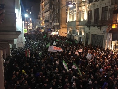 Sivil toplum kuruluşları Halep’te yaşanan katliama dikkat çekmek için Galatasaray Meydanı’nda toplanarak Rusya Konsolosluğu önüne yürüdü. Sloganlar eşliğinde yürüyen grup yaşanan katliamı protesto ederek basın açıklaması yaptı.