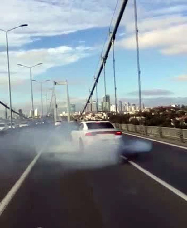 Aracın lastiklerinden çıkan dumanlar tüm köprüyü kaplarken, bazı vatandaşlar korna çalarak durumu protesto etti. Bu sırada diğer araç sürücülerinden biri de köprü üzerinde geri geri aracını kullandı. Gençlerin trafiği tehlikeye sokarak yaptığı bu şov vatandaşların büyük tepkisini çekti.