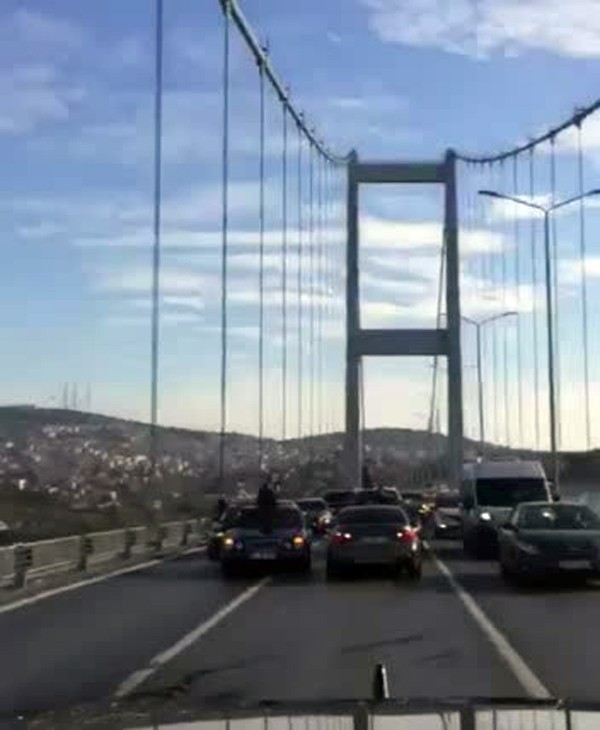 15 Temmuz Şehitler Köprüsü’nü trafiğe kapatan gençler köprü üzerinde araçlarıyla drift yaptı. Tüm bu yaşananlar cep telefonu kamerasına yansırken, bu sırada başka bir gencin aracıyla köprü üzerinde geri geri gittiği görüldü.
