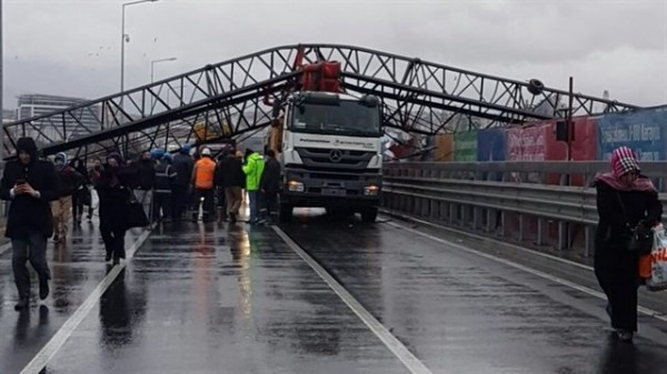 Olumsuz hava koşullarının günlük hayatı olumsuz etkilediği İstanbul'da, bir vinç fırtına nedeniyle Büyükçekmece'de E-5 karayoluna devrildi. Yoldan geçen bazı araçlar vincin altında kalarak zarar gördü.