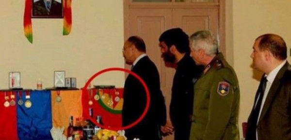Teröriste övgüler yağdıran Ohanyan, Ermenistan merkezli bir haber ajansının yayınladığı fotoğrafta ise teröristin fotoğrafının altındaki PKK terör örgütü paçavrası ve madalyalar dikkat çekti.