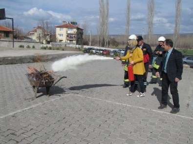 söndürme tüpü ile yangının nasıl söndürüleceği tatbiki olarak gösterilmiştir.