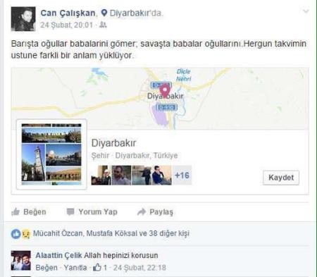 Şehit Can Çalışkan'ın sosyal medayadaki paylaşımında 'Barışta oğullar babalarını gömer, savaşta babalar oğullarını. Her gün takvimin üstünde farklı bir anlam yüklüyor” sözleri dikkati çekti.