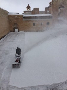 Doğubayazıt ilçesinde karla kaplanan İshak Paşa Sarayı’nda görevlilerce avluda biriken karlar temizlendi.