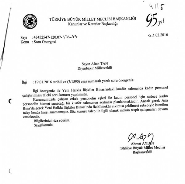 HDP Milletvekili Altan Tan'ın Meclis'teki başörtülü çalışanların kuaför sorunuyla ilgili soru önergesine cevap geldi.