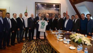 BTSO Yönetim Kurulu Başkanı İbrahim Burkay, Bursaspor Başkanı Ali Ay’a ‘hayırlı olsun’ ziyaretinde bulundu. Burkay, şehrin önemli markası olan Bursaspor’un daha büyük başarılara imza atması için ellerinden gelen desteği vermeye devam edeceklerini söyledi.