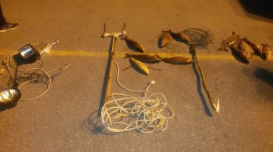 elektrik kablosu, 2 projektör ile 1 jeneratör çatalı bulan ekipler, avda kullanılan malzemelerle birlikte gölden avlanan 10 kilo ağırlığındaki sazan balığına da el koydu.