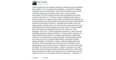 PKK denen kansız hain topluluğu burada 500 metre yakınım da 7 silah arkadaşımı şehit etti. O devleti suçlayanlar neredeydiniz? neden çıkıp aynı yüreklilikle PKK haindir suçludur demediniz? Bırakın devleti suçlamayı en büyük istihbarat kişinin kendidir. Duyduğunuzu gördüğünüzü jandarmayla, polisle MİT’le paylaşmazsanız (görüp şüphelenip, hissedip paylaşmayanlar için söylüyorum) en az o bombayı patlatan kadar o masumların kanında sizinde parmağınız var demektir. O arabayı -hadi iddia ettiğiniz gibi devlet farketmedi- de koca Ankara’da hiç mi kimse görmedi. Bir tanesi de çıkıp bu arabada garip bi hal var neden demedi? Maalesef hırsız içeriden olunca kapı kilit tutmaz. Devir tek yürek olma devridir. Yeterince suçlayanımız var zaten bide kalkıp devleti suçlayarak hainlerin ekmeğine yağ sürmeyin. Millet olarak başımız sağolsun hiç bir dilde hiç bir sözlükte bu acıyı anlatacak harf dahi yok. Umarım bu son olur. El ele verirsek ellere karşı dik dururuz... Üstçavuş H.T.”