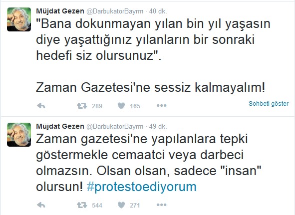 Bu kararın ardından twetter'dan açıklamalarda bulunan Müjdat Gezen halkı adeta isyana teşvik etti. Gezen CHP'nin kanalı Halk TV'de Cumhurbaşkanı Erdoğan'a ağır hakaretlerde bulunmuş terbiye sınırlarını aşmıştı.