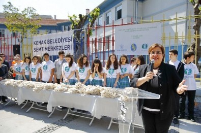 Alsancak Dominik Caddesi’ndeki etkinlikte öğrenciler, Başkan Pekdaş’la birlikte etkinliği izleyen vatandaşlara ve çevre esnafa Konak Belediyesi’nin Kadın, Sosyal Politikalar ve Projeler Müdürlüğü’ne bağlı İsmetpaşa Semt Merkezi kursiyerlerinin diktiği bin adet bez torba armağan etti.