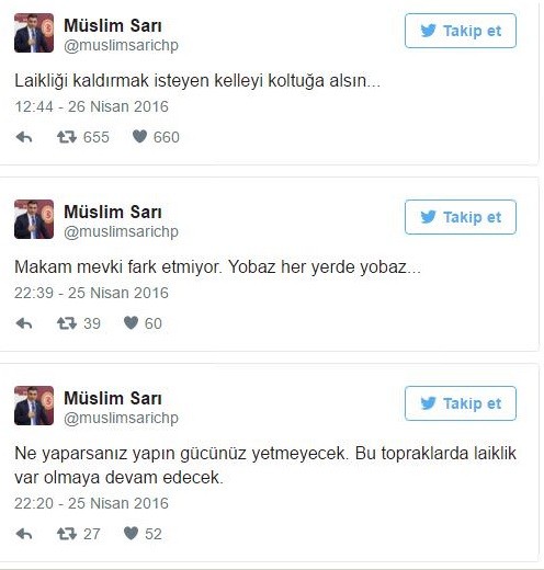 Sosyal medayada yaptığı açıklamada kimsenin bu topraklardan laikliği kaldırmaya gücü yetmeyeceğini belirten Sarı, Meclis Başkanı'nı hedef alarak, 'Laikliği kaldırmak isteyen kelleyi koltuğa alsın...' ifadelerini kullandı.