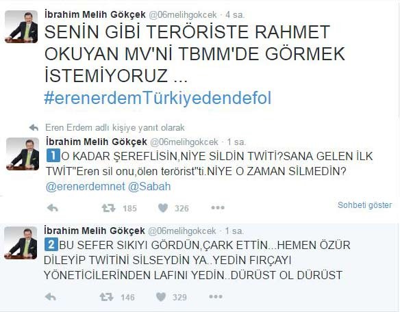 Teröriste rahmet dileyen CHP'li Eren Erdem'e Melih Gökçek'ten tepki geldi; "Senin gibi teröriste rahmet okuyan milletvekilini TBMM'de görmek istemiyoruz"