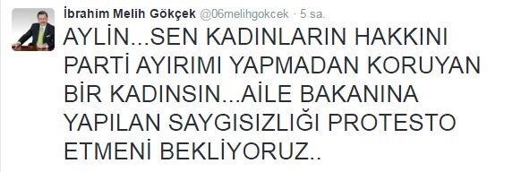 ' Aylin...Sen kadınların hakkını parti ayırımı yapmadan koruyan bir kadınsın...Aile bakanına yapılan saygısızlığı protesto etmeni bekliyoruz..'