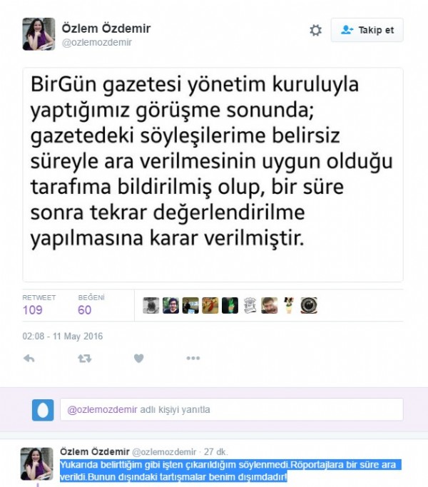 Bugün sosyal medya hesabından açıklama yapan editör Özlem Özdemir, 'BirGün gazetesi yönetim kuruluyla yaptığımız görüşme sonunda; gazetedeki söyleşilerime belirsiz süreyle ara verilmesinin uygun olduğu tarafıma bildirilmiş olup, bir süre sonra tekrar değerlendirme yapılmasına karar verilmiştir'