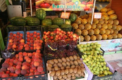 su kaybı fazla olduğu için oruç tutan kişilerin sulu gıda tüketimine daha fazla özen gösterdiklerini kaydeden Hancıoğlu, “Ramazan münasebetiyle en çok soğuk ve sulu meyveleri tercih ediyor müşterilerimiz. Kavun ve karpuz satışları çok hızlı. Bunun yanı sıra şeftali, üzüm, kirazda hızlı satılıyor. Sebze olarak ise yeşillik çeşitleri salata yapmak amacı salata çeşitleri fazla gidiyor. Fiyatlar geçen seneye göre düşüşte, fiyatlar bayağı uygun müşteri istediği şekilde alabiliyor. Karpuz ve kavunun kilogram fiyatı 1 TL yani fiyatlar uygun. Domatesin satışları da çok iyi düşük şu anda 1 TL’den satılıyor. Domates Rusya’ya gitmediği için iş piyasada eritilmeye çalışılıyor” diye konuştu.