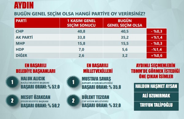 Aydın'da yapılan anket sonuçlarında da “Bugün seçim olsa hangi partiye oy verirsiniz?” sorusuna seçmenler, yüzde 40.5 oy oranıyla CHP yanıtını verdi. Sıralamada yüzde 35.2 ile AK Parti ikinci, yüzde 15.5 ile MHP üçüncü oldu. Aydın'da 1 Kasım genel seçimlerinden sonra oylarını tek yükselten parti AK Parti oldu.