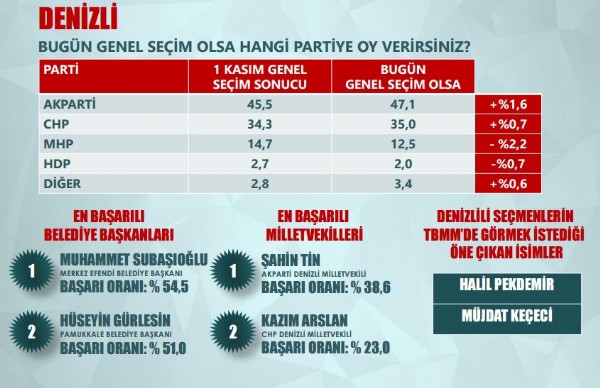 Ege Bölgesi'nde geniş kapsamlı yapılan araştırmada Denizli ili de yer aldı. Vatandaşlar, bu ilde de “Bugün seçim olsa hangi partiye oy verirsiniz?” sorusuna yüzde 47.1 ile AK Parti yanıtını verdi. Denizli'de ankete göre ise CHP yüzde 35'lik oyla ikinci, MHP yüzde 12.5'lik oranla üçüncü sırada kendine yer bulabildi. Denizli'de En Başarılı Milletvekili kategorisinde yüzde 28.6 ile AK Parti Denizli Milletvekili Şahin Tin birinci, yüzde 23 ile CHP Denizli Milletvekili Kazım Arslan ikinci sırada yer alarak Tin'i takipte kaldı. Anketler En Başarılı Belediye Başkanı ise yüzde 54.5 oyla Merkez Efendi Belediye Başkanı Muhammet Subaşıoğlu çıktı.