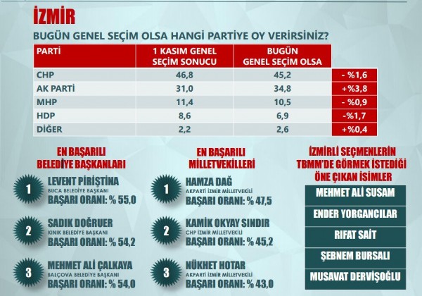 En Başarılı Milletvekili sıralamasında ise anketlere göre AK Parti İzmir Milletvekili Hamza Dağ birinci oldu. İkinci sırada CHP İzmir Milletvekili Kamil Oktay Sındır, üçüncü sırada ise AK Parti İzmir Milletvekili ve Genel Başkan Yardımcısı Nükhet Hotar yer aldı. İzmirli seçmenlerin TBMM'de görmek istediği isimler arasında da Mehmet Ali Susam birinci, Ege Bölgesi Sanayi Odası (EBSO) Başkanı Ender Yorgancılar ikinci sırada yer aldı. Seçmenlere yöneltilen sorulara göre ‘En Başarılı Belediye Başkanı' sıralamasında yüzde 55 oy oranıyla Levent Piriştina birinci oldu. İkinci sırada yüzde 54.2 oyla Kınık Belediye Başkanı Sadık Doğruer, yüzde 54'lük oy oranıyla Balçova Belediye Başkanı Mehmet Ali Çalkaya da üçüncü oldu.