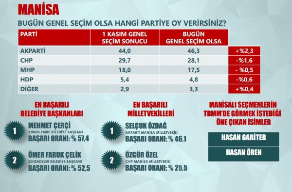 Manisa'da yapılan ankette ise seçmenler “Bugün seçim olsa hangi partiye oy verirsiniz?” sorusuna yüzde 46.3 ile AK Parti yanıtını verdi. AK Parti'nin hemen arkasında 28.1 ile CHP ikinci, yüzde 17.1 ile MHP üçüncü olabildi. Ankete göre Manisa'da En Başarı Milletvekili yüzde 46.1 ile Selçuk Özdağ oldu. Özdağ'ı yüzde 25.5 ile CHP'li Özgür Özel takip etti. Yanıtlara göre Yunus Emre Belediye Başkanı Mehmet Çerçi'de yüzde 57.4 ile En Başarılı Belediye Başkanı listesinde yerini koruyarak birinciliğini sürdürdü. Şehzadeler Belediye Başkanı Ömer Faruk Çelik'te yüzde 52.5'lik oyuyla Çerçi'yi hemen peşinde yer buldu.