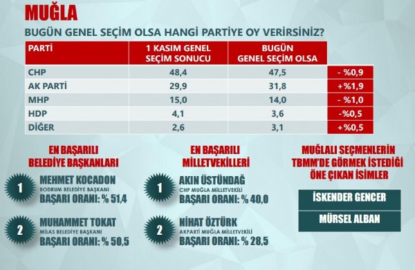 Seçmenler Muğla'da 1 Kasım Genel Seçimlerinden sonra “Hangi partiye oy verirsiniz?” sorusuna yüzde 47.5 ile CHP yanıtını verdi. AK Parti bu ilde 31.8'lik oranla oyunu artırırken, MHP yüzde 14.0'lük oranla üçüncü oldu. En Başarı Milletvekili sıralamasında yüzde 40'lık oyla CHP Muğla Milletvekili Akın Üstündağ birinci; En Başarılı Belediye Başkanı sıralamasında ise Bodrum Belediye Başkanı Bodrum Belediye Başkanı Mehmet Kocadon ise yüzde 51.4'lük oranla birinciliği az bir farkla göğüsledi.