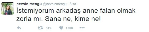 CNN Türk spikeri Nevşin Mengü, Cumhurbaşkanı Recep Tayyip Erdoğan'ın 'Anneliği reddeden evini çekip çevirmekten vazgeçen kadın, iş dünyasında istediği kadar başarılı olsun eksiktir, yarımdır' sözlerine ithafen Twitter'dan 'İstemiyorum arkadaş anne falan olmak zorla mı? Sana ne, kime ne!' şeklinde skandal ifadeler kullandı.