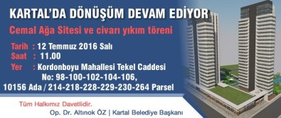 12 Temmuz 2016 Salı günü saat 11.00’de düzenlenecek yıkım töreniyle, Kordonboyu Mahallesi Tekel Caddesi üzerinde 8 bin metrekarelik bir alanda yer alan Cemal Ağa Sitesi’nden 3 Blok, Gülhan Apartmanı, Nimet Örs Apartmanı, İyidere Apartmanı ve yanında bulunan 1 yapı, Kartal’da devam eden dönüşüm zincirine dahil olarak yeni ve güvenli binalarına kavuşacak.